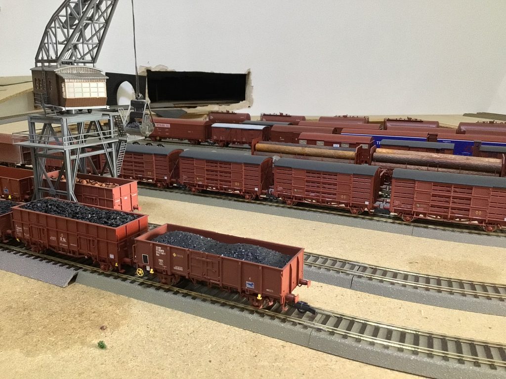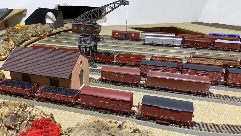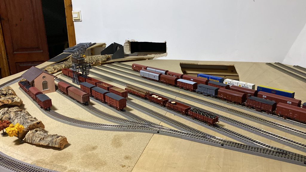 Mas tarde, al cabo de unos meses pusimos unos trozos de corcho simulando unas rocas, un pequeño almacén, una grúa de carbón para tratar de que pareciese una estación de clasificación. Durante unos meses esa estación de clasificación sencilla y casi de juguete no sirvió de mucho, dándonos algunas horas de juego mientras pensábamos en como dar mas realismo a esa zona. Y como quien no quiere la cosa, esas horas de juego llegaron hasta bien entrado el mes de abril de 2024…