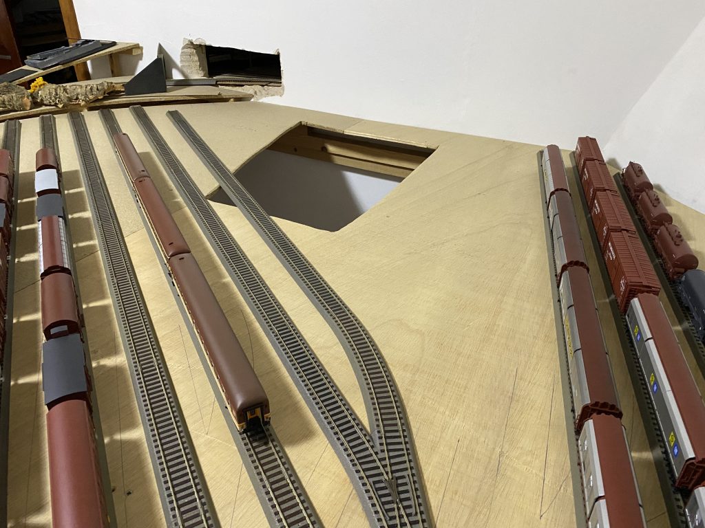 A principios del año 2023, los avances de la maqueta eran escasos. Curiosamente, teníamos una gran superficie de la misma donde no teníamos ni idea de que es lo que podríamos hacer. Rodeando esta gran superficie transcurrió la línea de vía única del circuito exterior. Esta superficie la usábamos para tener material siempre a mano, organizados los vagones por grupos o tipos de carga, pero no dejaba de ser una gran mesa llena de vagones agrupados.
