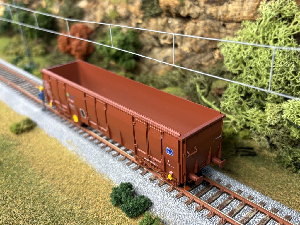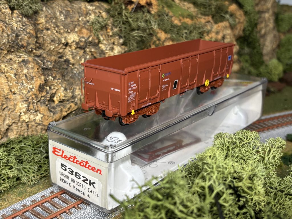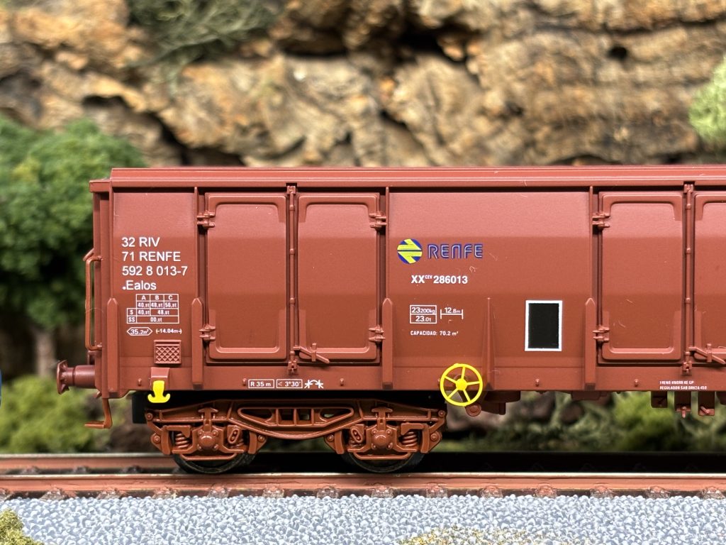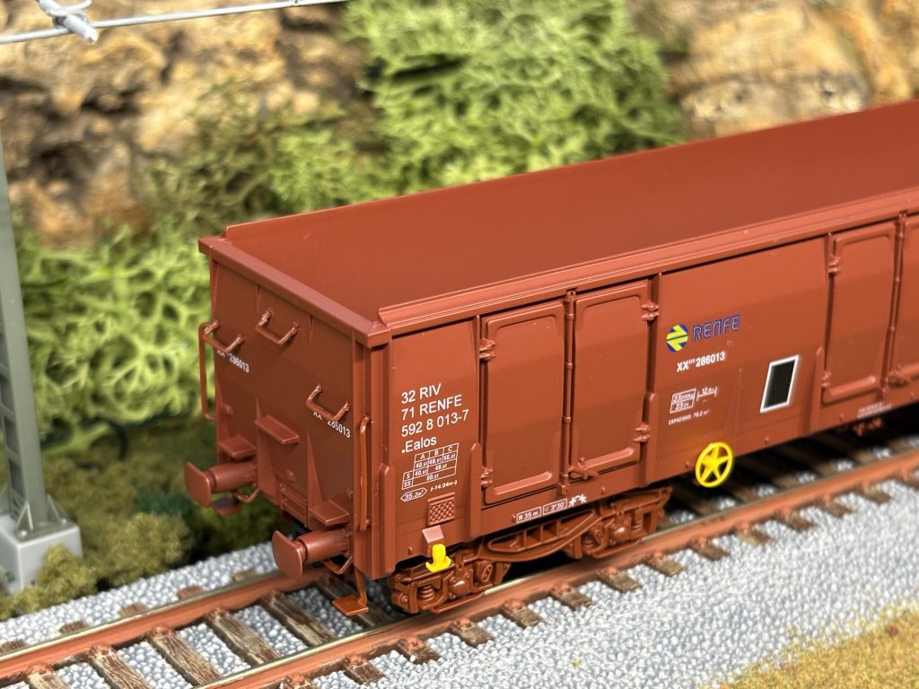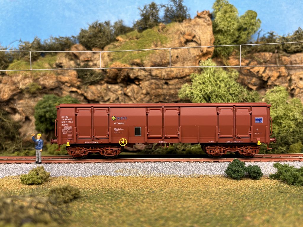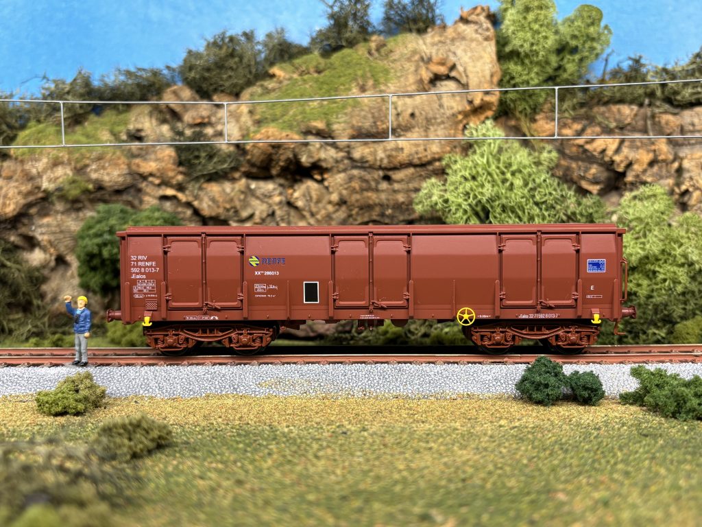 Modelo a escala: ELECTROTREN reproduce fielmente este tipo de vagón de la serie 286000, inclusive los bajos del mismo. Ruedan perfectamente y el enganche elongable trabaja muy bien. El modelo lleva las matriculas RENFE XX-286013 y la UIC 32 71 592-8 5013-7.
