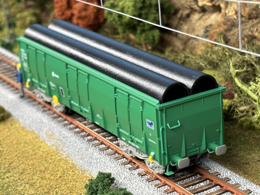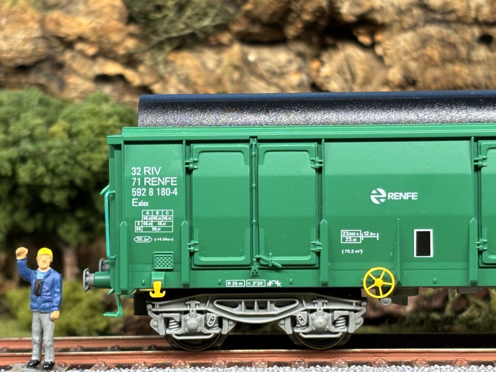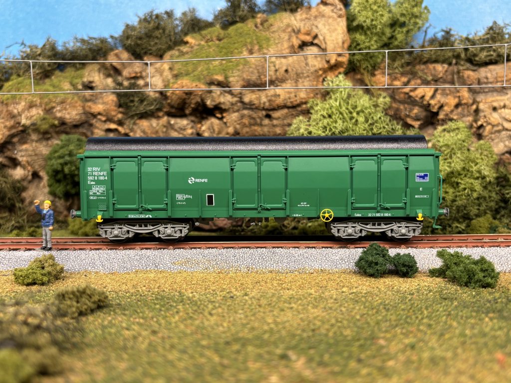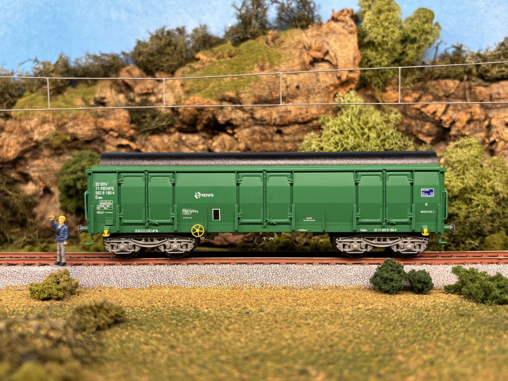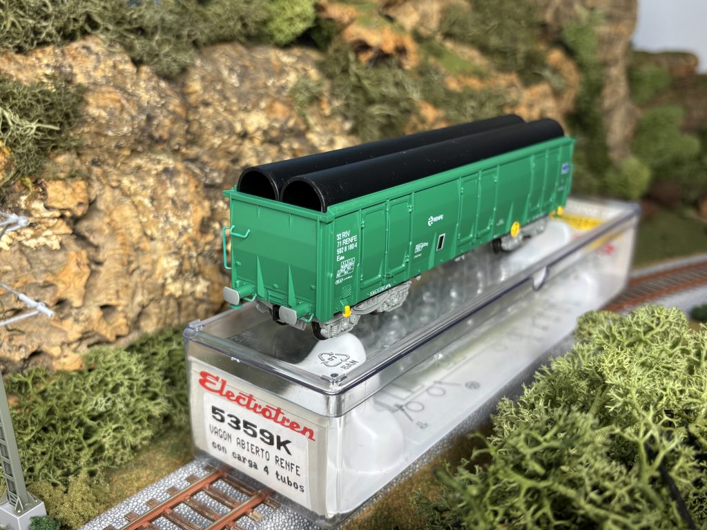 Modelo a escala: ELECTROTREN reproduce fielmente este tipo de vagón de la serie 286000, inclusive los bajos del mismo. Ruedan perfectamente y el enganche elongable trabaja muy bien. El modelo lleva solamente la matricula UIC 32 71 592-8 180-4. Lleva una carga de tubos, si bien no era la carga para la que se había construido este vagón.