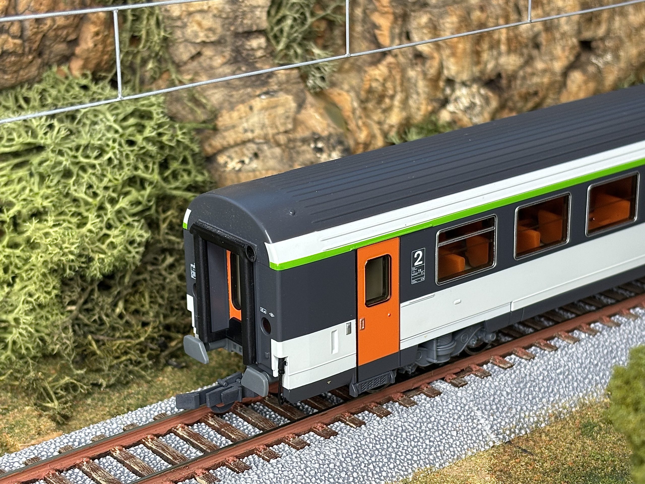 El modelo a escala: El modelo a escala propuesto por ROCO referencia 45733, es una replica exacta del modelo CORAIL tipo VTU francés de 2ª clase de la SNCF, tanto en la caja, bastidor, bajos.. Con un excelente acabado y un rodaje muy fino. La numeración 61 de su numeración UIC implica que es un coche para servicio EUROCITY.