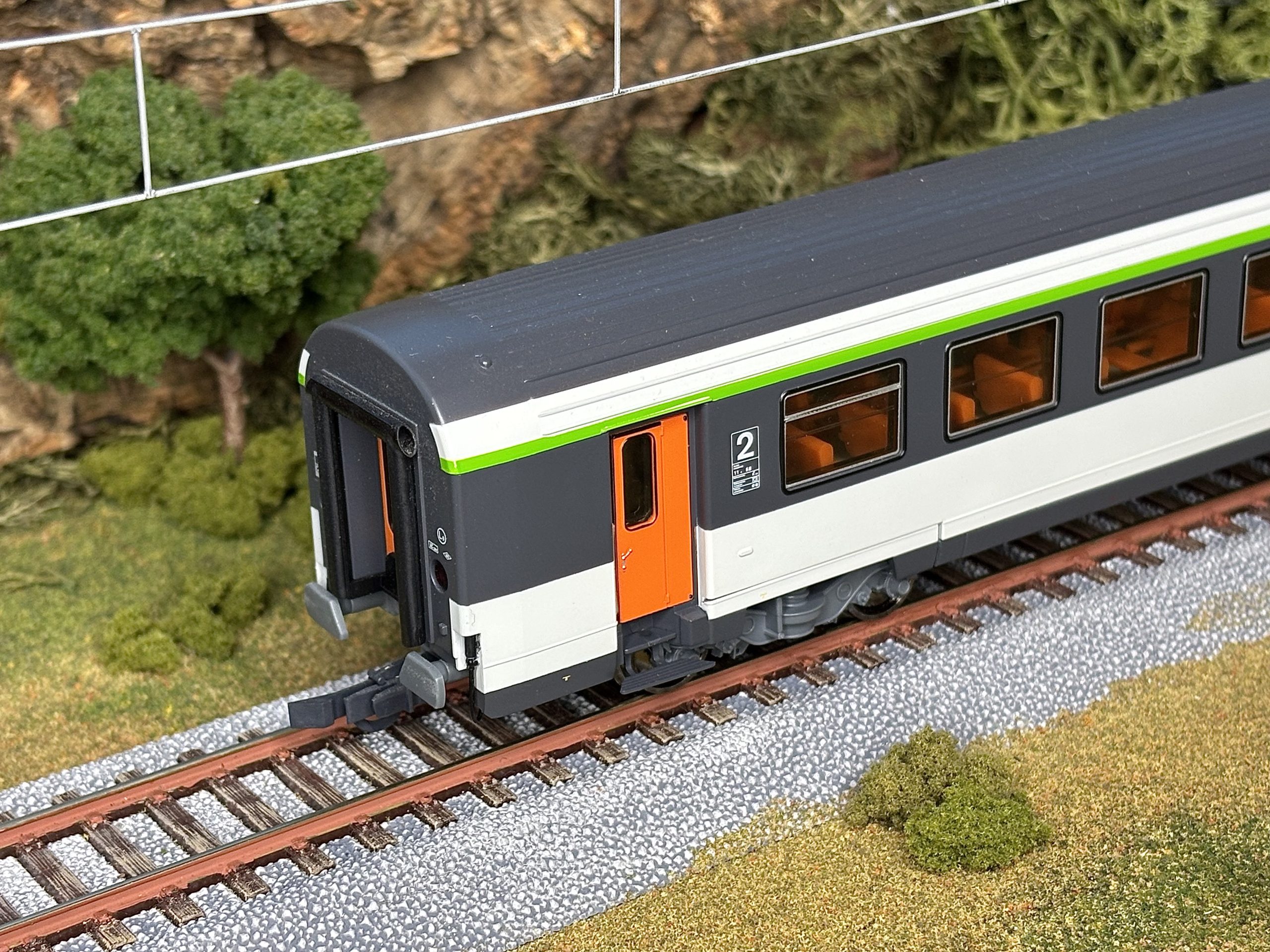 El modelo a escala: El modelo a escala propuesto por ROCO referencia 45736, es una replica exacta del modelo CORAIL tipo VTU francés de 2ª clase B11rtu de la SNCF, tanto en la caja, bastidor, bajos.. Con un excelente acabado y un rodaje muy fino.