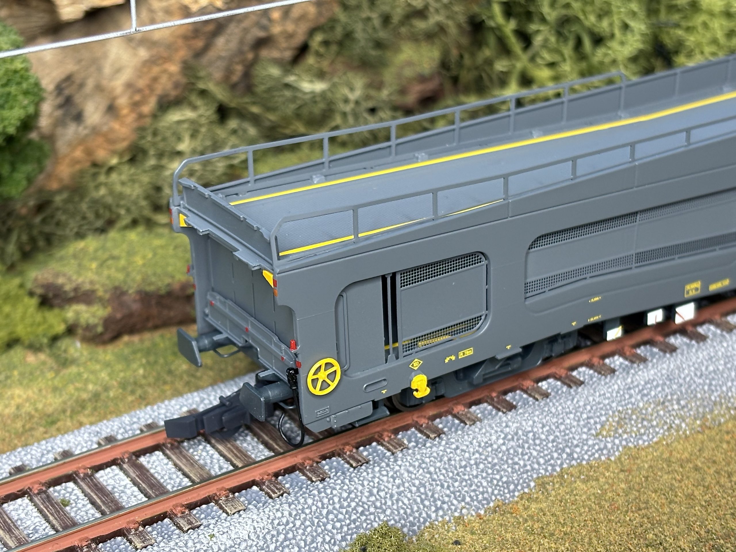 El modelo a escalaELECTROTREN reproduce fielmente con la referencia HE4042 un modelo de plataforma auto-expreso serie DD-9500 para tráfico nacional. Leva la matrícula RENFE DD-9557 y la UIC 04 71 98-70 058-6. Es un modelo muy bien realizado, en base a moldes nuevos y exclusivos para esta reproducción. El bastidor está hecho en metal para conferirle un peso adecuado, y tiene un rodaje muy fino.