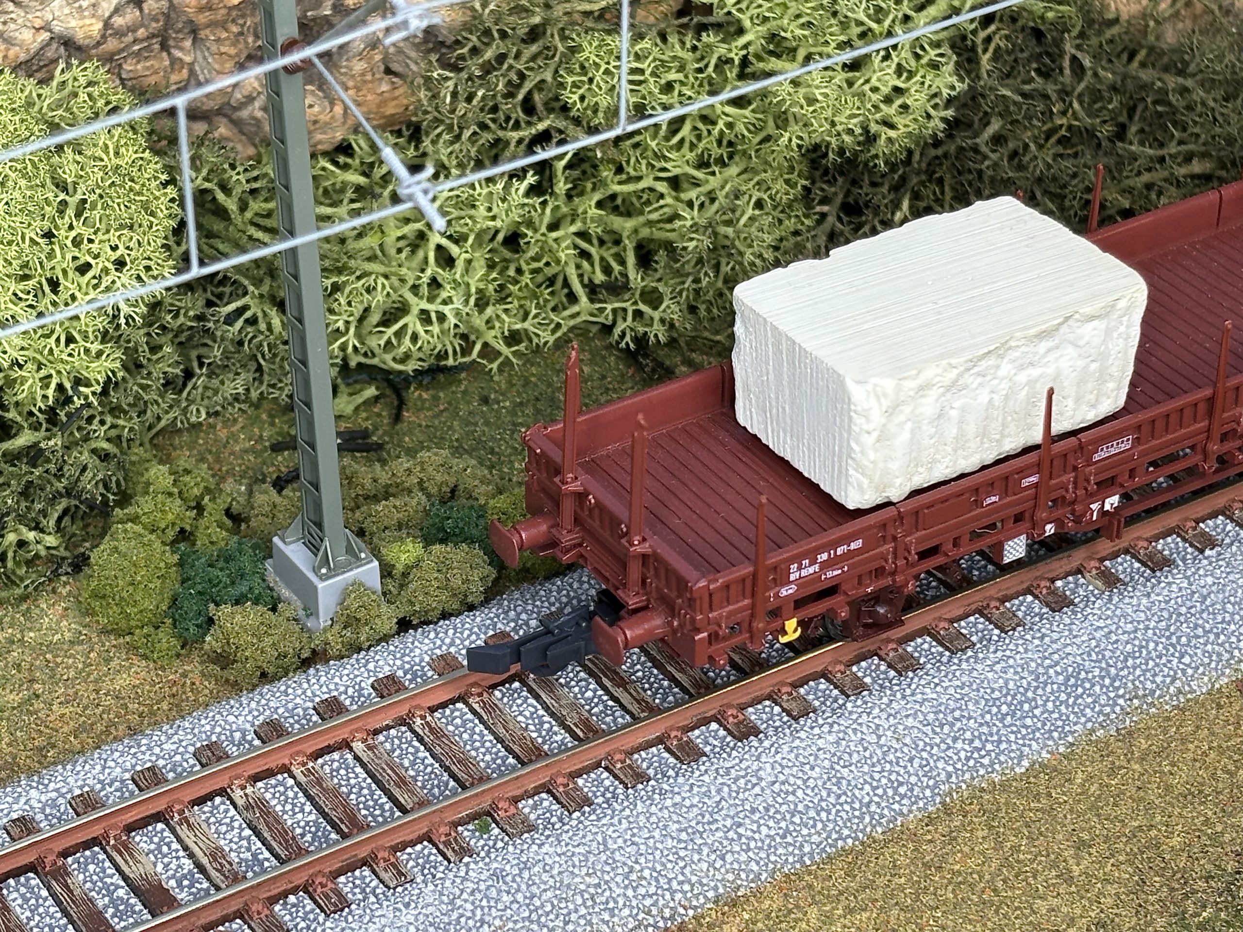 El modelo a escala: el vagón ELECTROTREN E1336 reproduce fielmente un vagón plataforma de teleros RENFE de la serie M-460000, del pedido de los años 83/84. Esta unidad lleva tan solo marcada la matrícula UIC Lis 22 71 330-1 071-9, y la carga aplicada de bloques de granito, es también correcta. La matrícula equivalente en RENFE sería M-460071. Los detalles de los bajos del vagón, las medidas y la tampografía es mas que correcta.